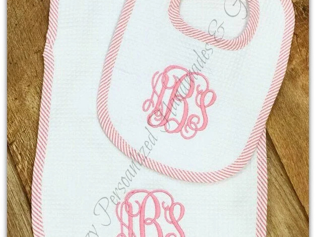 This personalized baby burp cloth and bib set is a timeless and thoughtful gift for any new baby. Made from soft, waffle weave absorbent fabric and finished with classic pink trim, blue and green trim, each set is custom embroidered with your choice of a monogram or first name for a keepsake parents will cherish.